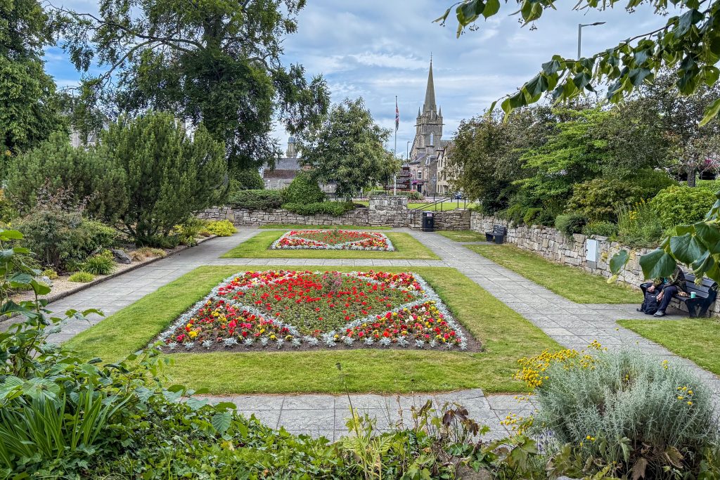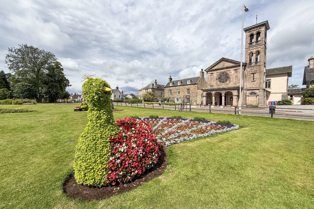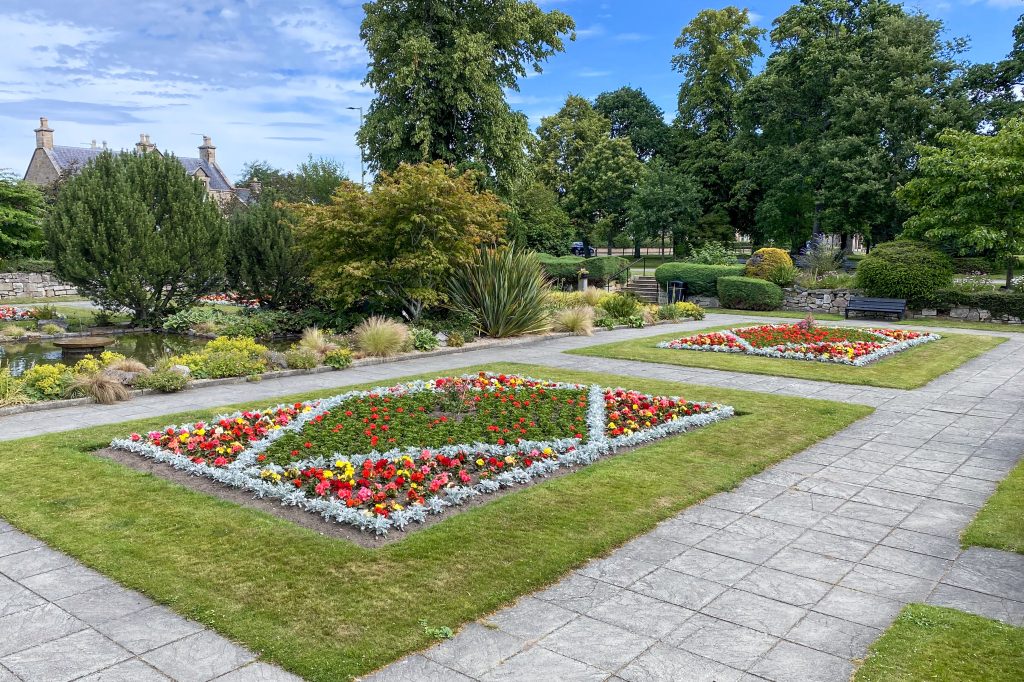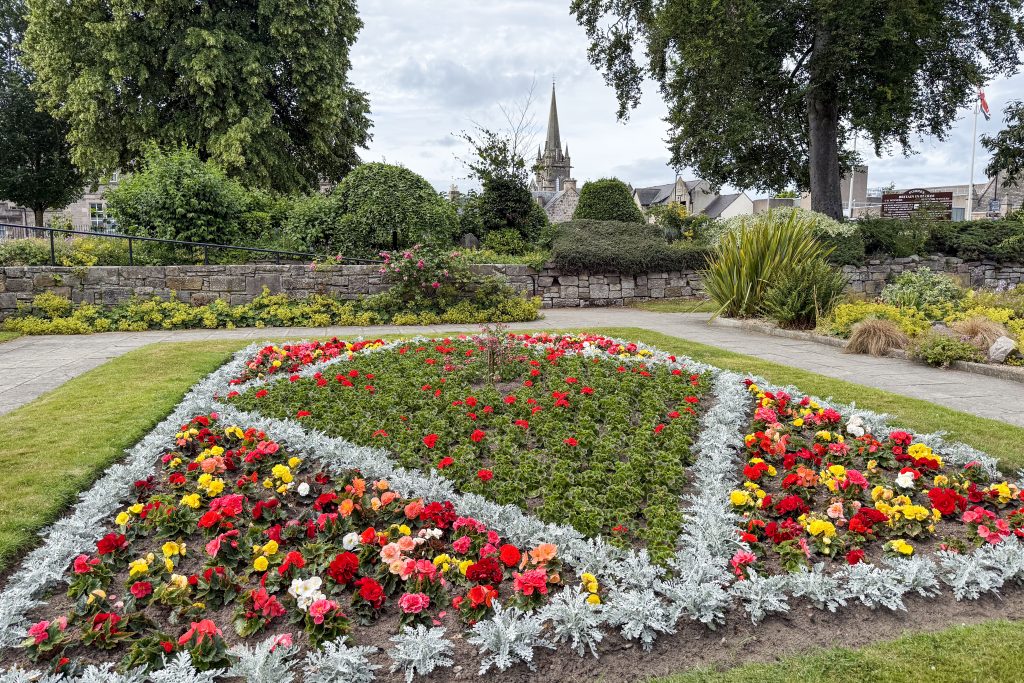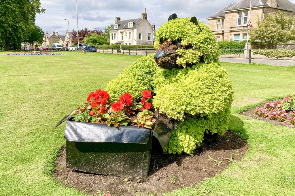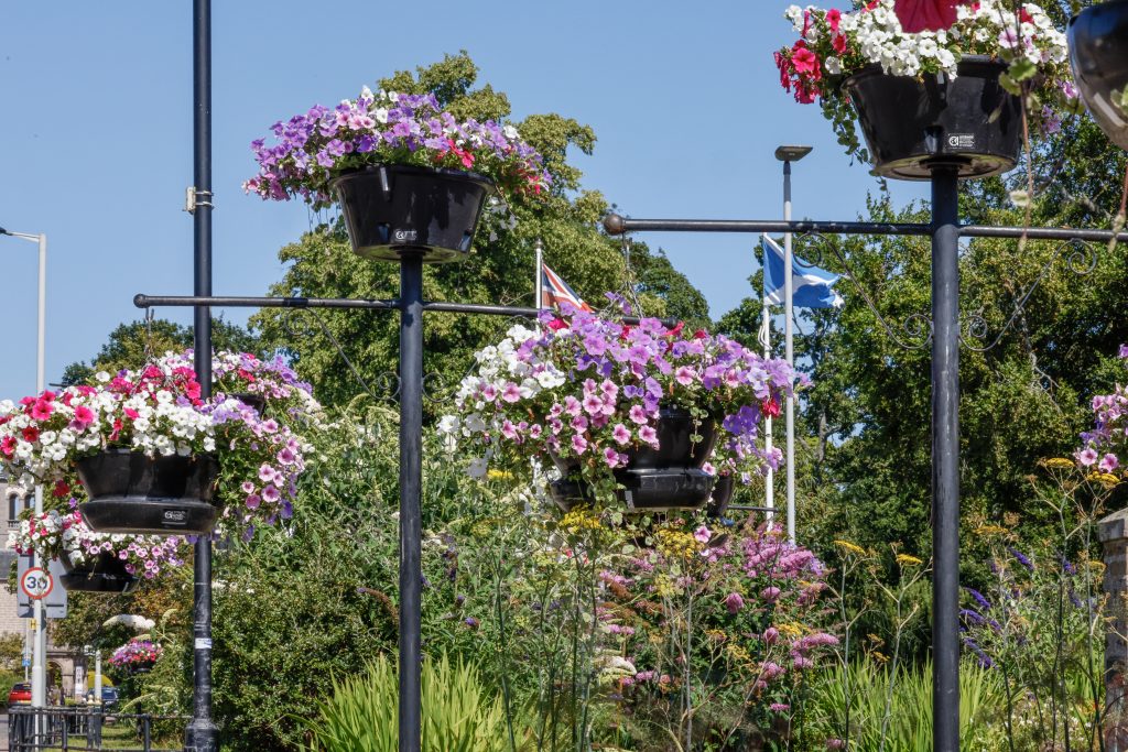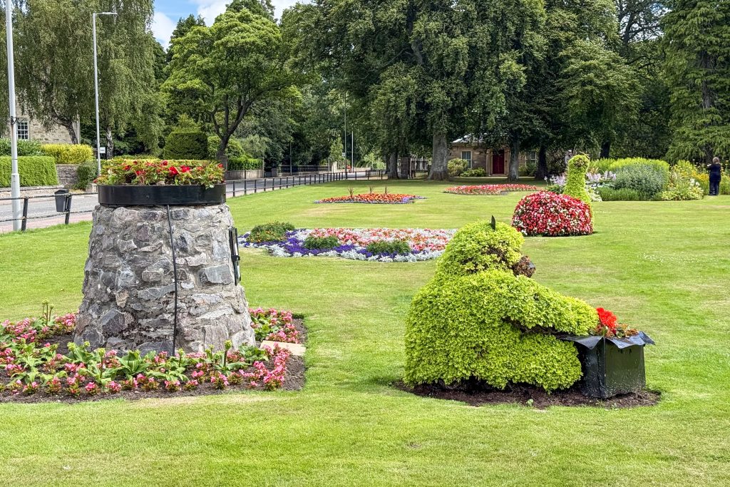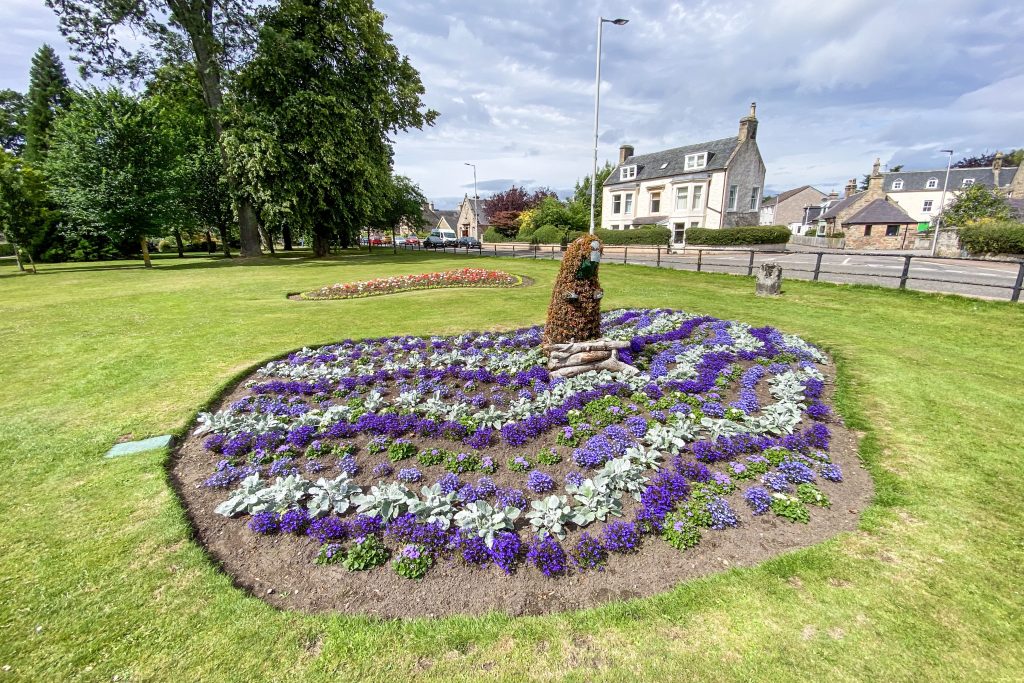 Once again the efforts of Forres in Bloom are brightening up the town with floral arrangements. Grant Park is blooming with its flower scultptures, the sunken garden memerises with its gemetric patterns, the high street is lined with baskets, and the war memorial i a stunning dash of colour.